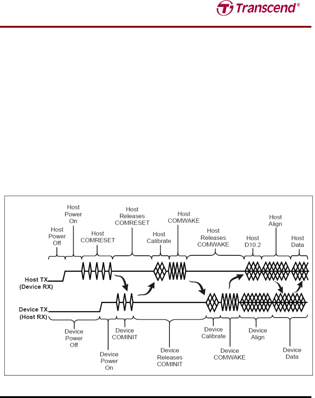 5. Host locks – after detecting the COMWAKE, the host starts transmitting D10.2 characters at its lowest supported rate.